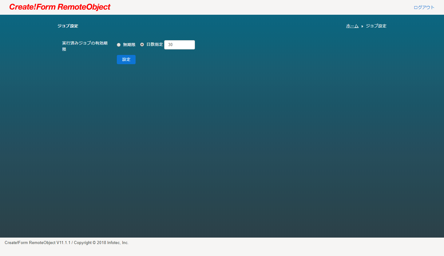 一定期間の経過後もジョブを削除せずに保管しておきたい場合は「無期限」を指定してください。 この場合、RemoteObject のクライアントAPIからジョブを削除しない限り削除されません。