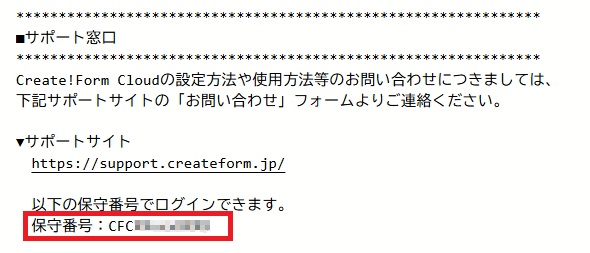 番号は、Create!Form Cloud 環境作成メール(サービスお申込み時に通知)に記載の CFCで始まる契約番号です。